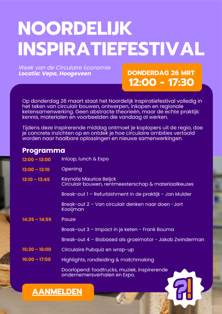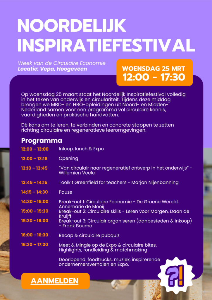 Tijdens het Noordelijk Inspiratiefestival komen onderwijs, bedrijfsleven en overheden samen om de verhalen achter inspirerende initiatieven uit Groningen en Drenthe te horen. Je ontmoet hier de makers, de doeners en de vernieuwers die laten zien hoe kleine stappen samen een beweging kunnen vormen.
